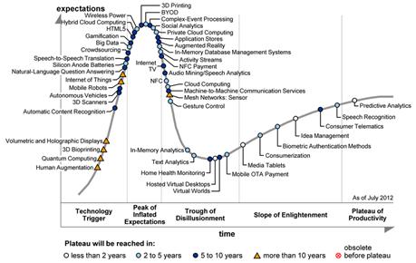 IT研究咨詢機構Gartner有一個"炒作周期"(HypeCycle)理論,根據該理論Gartner每年會發布新興技術成熟度曲線報告。該理論認為,一項新技術從產生到成熟再到為市場廣泛接受的全過程與受關注程度大致經過五個階段(如圖1所示)。
