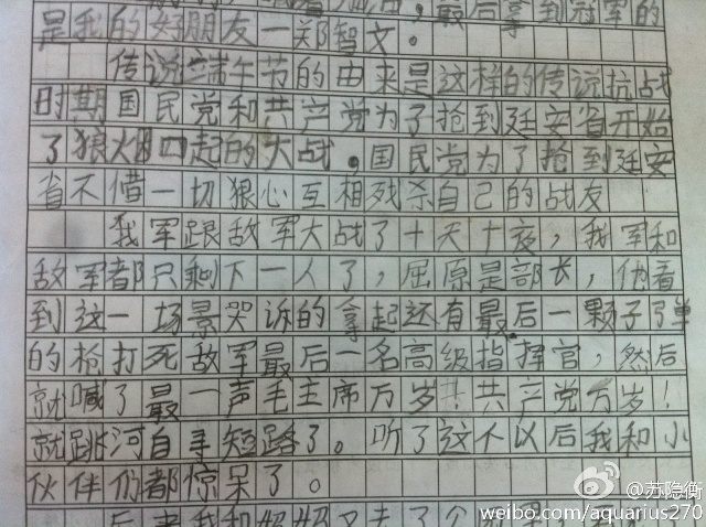 出處:2013年6月,一段講述端午節由來的小學作文內容截圖在微博網友中熱傳。這篇文章,最早由新浪微博網友“蘇隱衡”發表于2011年11月14日。援引其中的一句話“我和小伙伴們都驚呆了”被作為網絡流行語迅速傳播,短時間內成為了熱門話題。