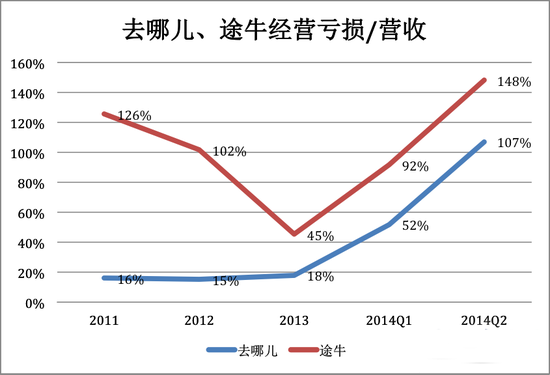2013年,去哪兒經營虧損增速為營收增速的22.3%。2014年情況迅速惡化,二季度營收環比增長19%,經營虧損增加了146%幾乎是營收增速的4倍! 途牛的情況更糟,今年二季度營收增長9%,經營虧損增加77%,為營收增長的8.6倍!