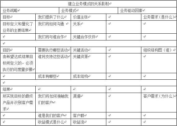 其結(jié)果就是一個(gè)標(biāo)識(shí)從業(yè)務(wù)到生產(chǎn)輸出所需輸入的框架。業(yè)務(wù)模式的輸入包括:關(guān)系、價(jià)值主張、關(guān)鍵活動(dòng)、關(guān)鍵資源、關(guān)鍵合作伙伴以及成本結(jié)構(gòu)。其輸出包括:渠道、收益流以及客戶群。圖1顯示了使用關(guān)系影射方法根據(jù)業(yè)務(wù)戰(zhàn)略制定業(yè)務(wù)模式的一個(gè)示例。