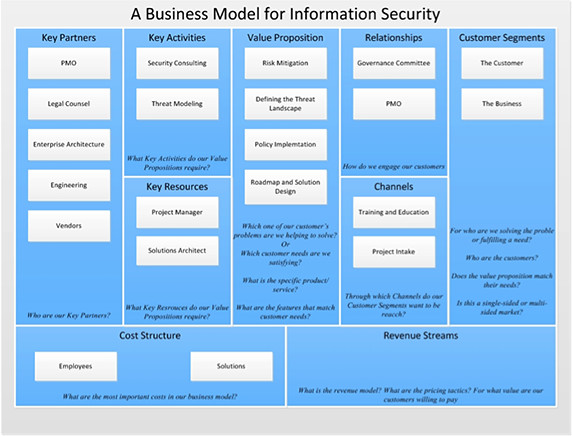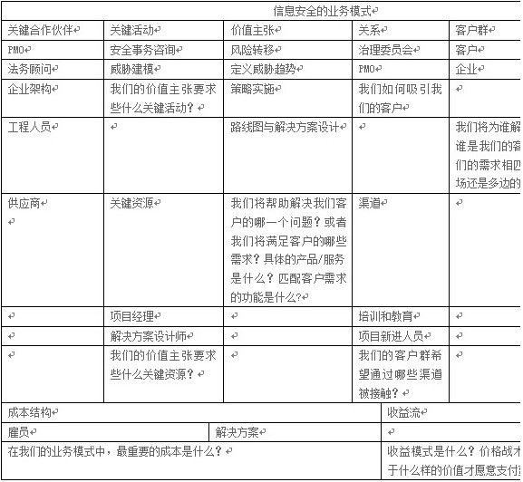 業(yè)務(wù)價(jià)值主張從本質(zhì)上來(lái)說(shuō)是動(dòng)態(tài)的,而保護(hù)計(jì)劃業(yè)務(wù)模式則是相對(duì)靜態(tài)的。關(guān)鍵資源是可控因素(例如,團(tuán)隊(duì)),它提供了價(jià)值主張。關(guān)鍵合作伙伴是那些在企業(yè)內(nèi)部你希望他們提供業(yè)務(wù)驅(qū)動(dòng)因素的人。圖2顯示了一個(gè)可跨多個(gè)行業(yè)使用的安全計(jì)劃的業(yè)務(wù)模式。
