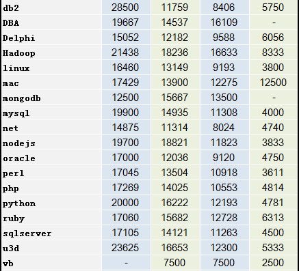 在應(yīng)屆生中,薪資水平最高的職位依次有:架構(gòu)師、mac、hadoop、技術(shù)經(jīng)理以及算法。最低的有vb、自動化測試、廣告算法。