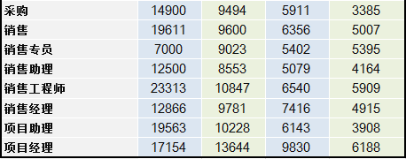 整體而言,媒體相關(guān)薪水較低,商務(wù)相關(guān)則薪水較高。在各職位1-3年經(jīng)驗薪水中:售后客服、銷售助理、售前咨詢等職位薪水最低。