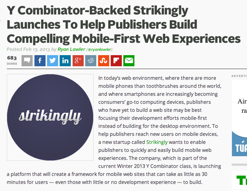 當Strikingly已經用盡了身邊的朋友以及朋友的朋友后,網站的增長到達了一個瓶頸期。這時團隊找到一些相對垂直且小型的科技媒體和創業媒體講述自己的故事,這些媒體也比較樂意來發布產品相關的信息和介紹。得到第一輪的PR之后,團隊把目標轉向主流的大眾媒體??墒谴蟊娒襟w一般不愿意報道一個這么早期的產品。團隊沒有放棄,用google搜索,goole api和mturk等人工的方法搜到了一堆媒體的聯系方式。一家一家去聯系,給每一家媒體都寫十分個性化的郵件,講自己的故事。最后終于有一家紐約時報愿意報道他們的故事。在被紐約時報報道了之后,再聯系其它媒體就變得容易多了。就這樣,他們上了50多家主流媒體,獲取了頭2萬名用戶的增長。