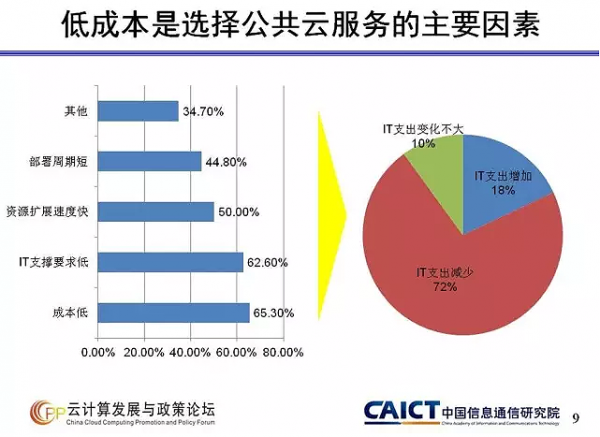 報告還進一步指出,“相對較低的成本”是用戶選擇公共云服務的主要因素,有65.3%的受訪者選擇了這一答案。此外,選擇“IT支撐要求低”“資源擴展速度快”“部署周期短”的用戶同樣,分別達到62.6%、50%和44.8%。72%的公共云服務用戶認為,采用公共云服務后,自己的IT支出變得更少;10%用戶認為自己的IT支出變化不大,相對持平,只有18%的用戶認為自己的IT支出有所增加。在服務的性價比方面,超過七成用戶對國內的公共云服務“比較滿意”或“很滿意”,只有0.8%的用戶覺得性價比較差。