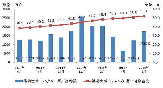 圖2 2014-2015年6月移動寬帶用戶當月凈增數和總數占比情況