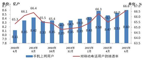 圖4 2014-2015年6月手機上網用戶和對移動電話用戶滲透率情況