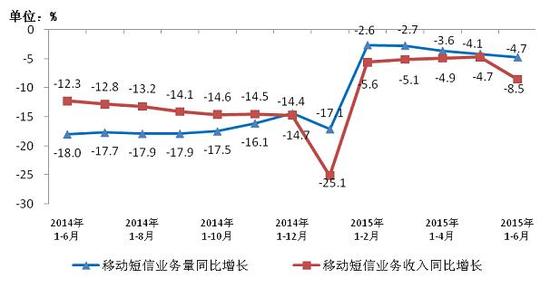 圖6 2014-2015年6月移動短信業務量和移動短信收入同比增長情況
