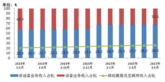 圖9 2014年-2105年6月話音、非話音、移動數據及互聯網收入占比情況
