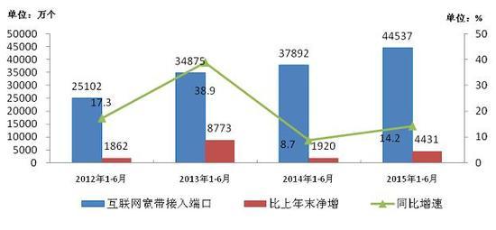 圖10 2012-2015年1-6月互聯網寬帶接入端口發展情況