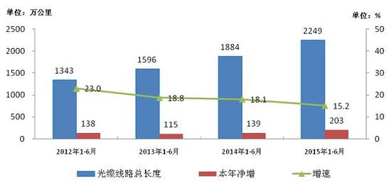 圖12 2012-2015年1-6月光纜線路總長度發展情況