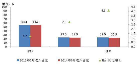 圖13 2015年6月東、中、西部電信主營業務收入同期比較