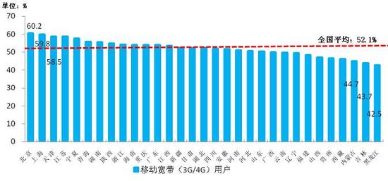 6月,東、中、西部地區移動寬帶(3G/4G)用戶分別比上年末凈增5102.3、2073.8、1961.9萬戶,東部地區的凈增用戶超過中西部地區凈增之和,但移動寬帶(3G/4G)用戶滲透率相差較小,東、中、西部地區移動寬帶(3G/4G)用戶滲透率均超過50%,達53.7%、50.2%和50.9%。各省間移動寬帶(3G/4G)用戶占比差異依然較大,占比高于50%的省份超過三分之二,其中北京、上海、天津、江蘇和寧夏分別居全國前五位,占比均超過57%。占比低于45%的省份有黑龍江、吉林和內蒙古,其中黑龍江占比全國最低,僅為42.5%。