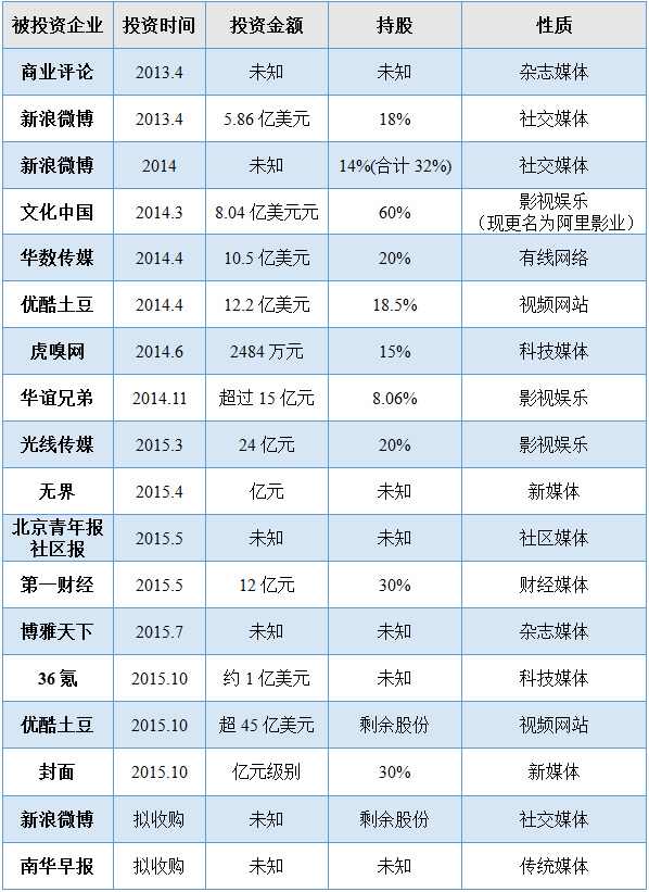 阿里投資和收購的媒體一覽表