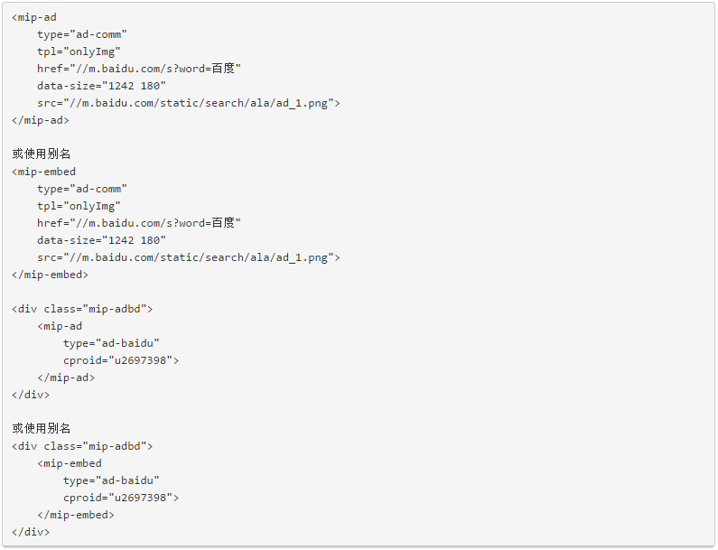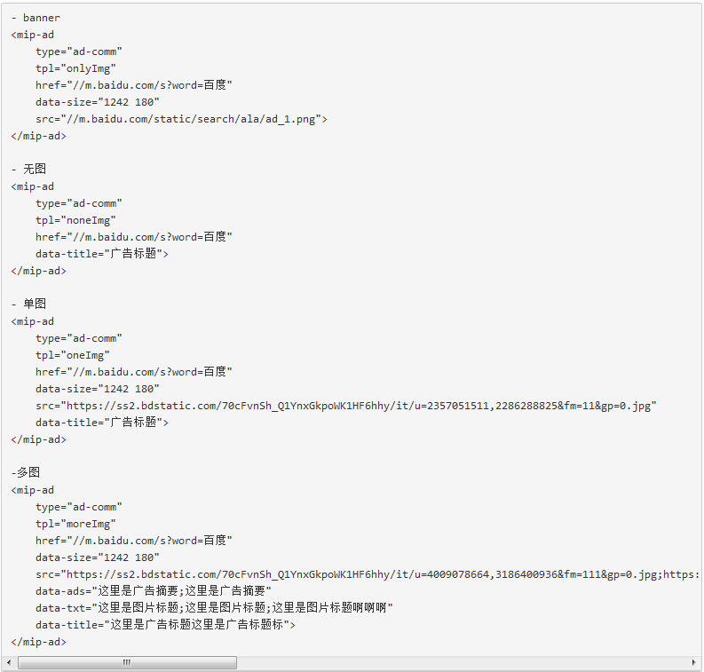 mip-ad 用來支持站長添加網頁內自定義廣告,主要包括連接、圖文,多圖,banner四種形式,這類廣告可以制定大小也可以被用戶關閉。