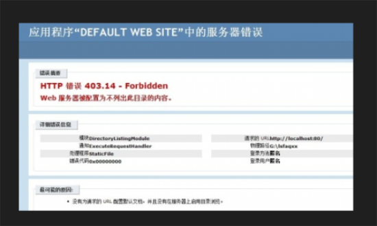 403.2403.2錯誤是由于"讀取"訪問被禁止而造成的。導致此錯誤是由于沒有可用的默認網頁并且沒有對目錄啟用目錄瀏覽,或者要顯示的HTML網頁所駐留的目錄僅標記為"可執行"或"腳本"權限。