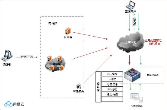 從服務的角度來說DDoS防護本質上是一場以用戶為主體依賴抗D防護系統與黑客進行較量的戰爭,在整個數據對抗的過程中服務提供者往往具有絕對的主動權,用戶可以基于抗D系統特定的規則,如:流量類型、請求頻率、數據包特征、正常業務之間的延時間隔等。基于這些規則用戶可以在滿足正常服務本身的前提下更好地對抗七層類的DDoS,并減少服務端的資源開銷。詳細示意圖如下: