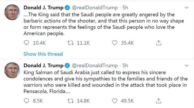 美國總統特朗普拒絕透露槍擊案是否涉恐怖主義,他在社交網站“推特”上向遇難者家屬表示慰問,并稱他已經收到沙特國王薩勒曼的來電。