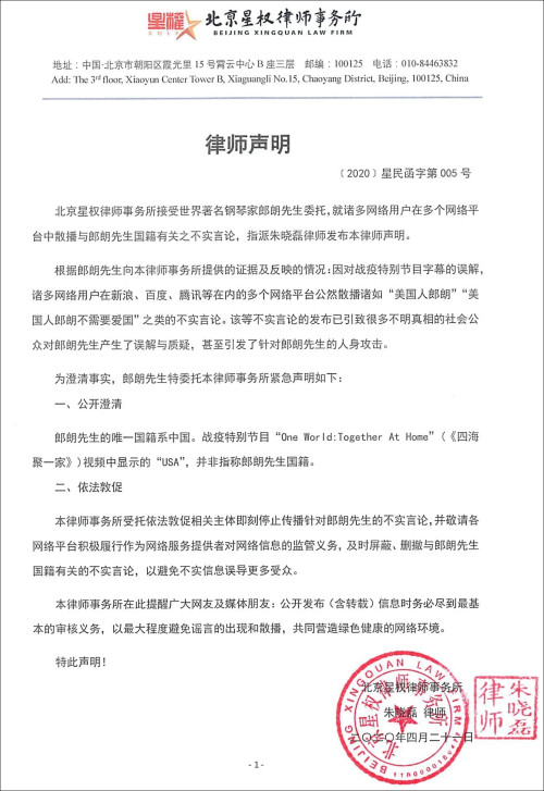 21日,郎朗工作室發(fā)布律師聲明否認(rèn)其擁有美國國籍,表示郎朗的唯一國籍是中國。