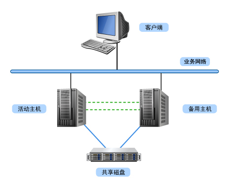 通過Rose HA系統(tǒng)把兩臺服務器與磁盤陣列系統(tǒng)相連,操作系統(tǒng)、應用軟件和Rose HA軟件分別安裝在兩臺服務器上,數(shù)據(jù)庫放在磁盤陣列上,而兩臺服務器通過心跳線連接。Rose HA高可用功能實現(xiàn)的關鍵在系統(tǒng)發(fā)生錯誤時進行切換,客戶端用戶并不會發(fā)現(xiàn)工作端有什么變化。