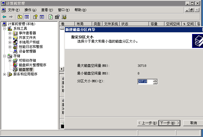 4.執行下一步,到下圖這個界面,選擇擴展磁盤分區。空間容量自己劃定分區的大小,如果不改,默認只分一個區,如圖: